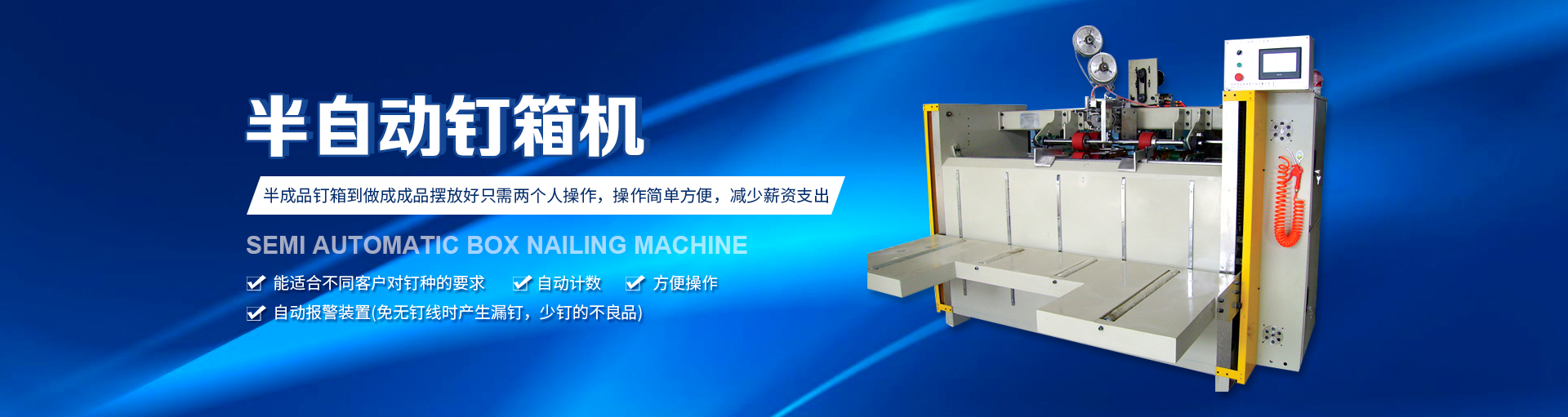 半自動(dòng)釘箱機(jī)設(shè)備特點(diǎn)釘箱機(jī)在現(xiàn)在的機(jī)械行業(yè)內(nèi)使用比較的廣泛,因?yàn)楝F(xiàn)在紙箱包裝機(jī)械的發(fā)展迅速,企業(yè)關(guān)于釘箱機(jī)的要求也越來越高,而組織制造業(yè)想要使設(shè)備更具競爭力,需要關(guān)于半自動(dòng)釘箱機(jī)的...查看詳情+